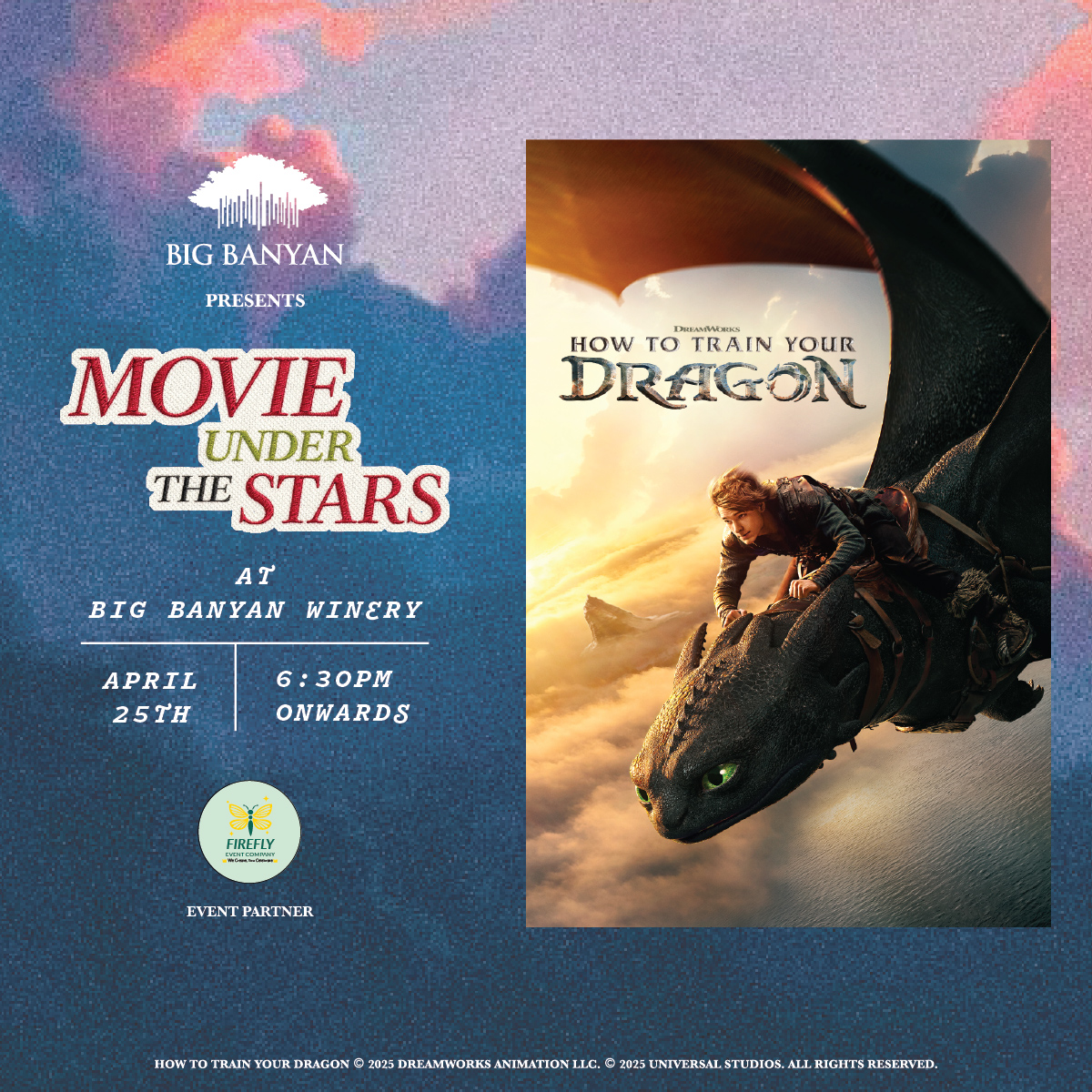 Enjoy a summer evening under the stars at the Big Banyan Winery with an open-air screening of How to Train Your Dragon (2025). Set beneath the night sky this thoughtfully curated experience is perfect for all ages.